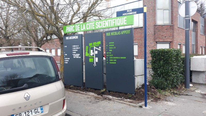 Notre équipe a conçu et installé 3 totems reliés par un bandeau pour la Cité Scientifique de Villeneuve-d'Ascq.